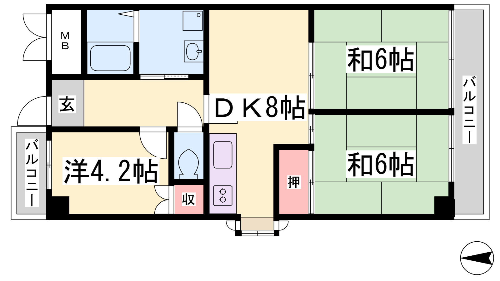 - DK8帖、和室6帖、和室6帖、洋室4.2帖