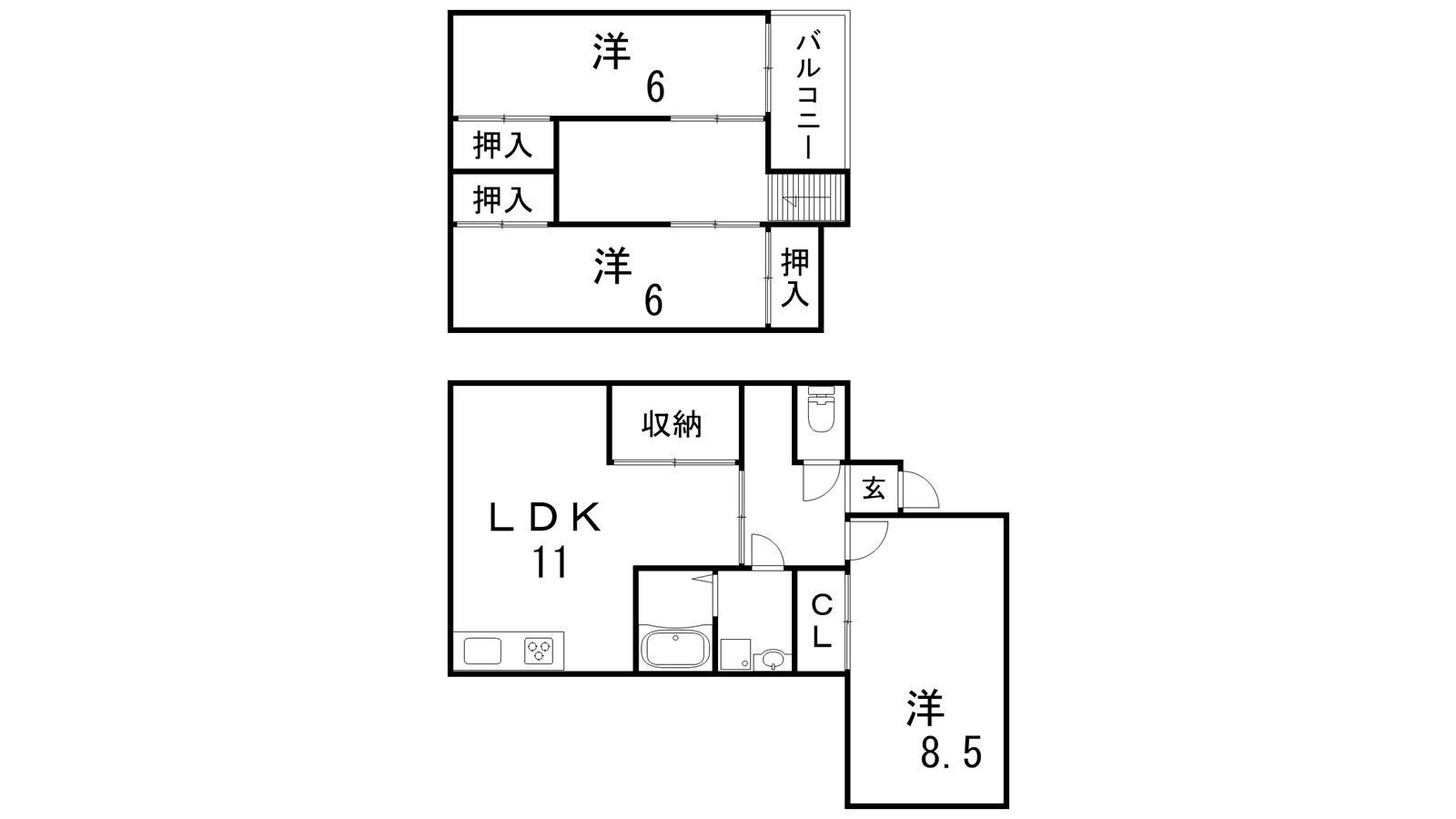- LDK11帖、洋室8.5帖、洋室6帖、洋室6帖