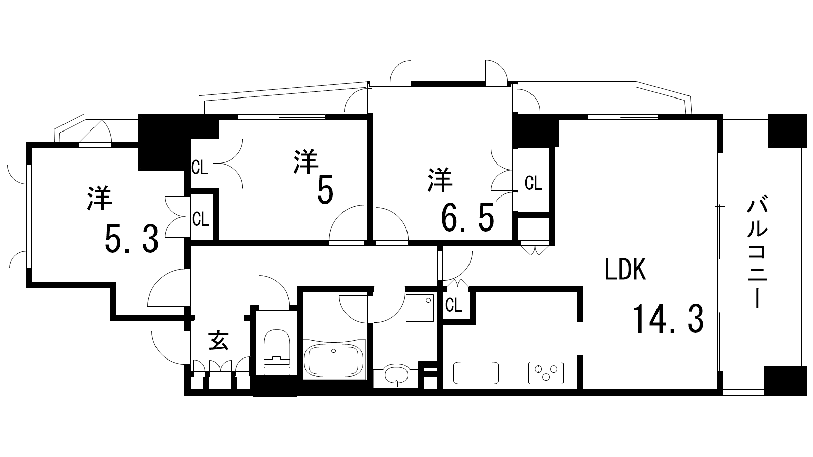 - LDK14.3帖、洋室6.5帖、洋室5.3帖、S5帖