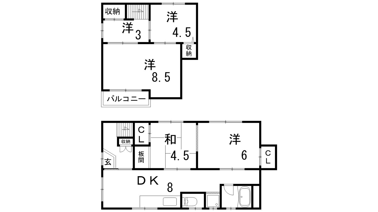 - DK8帖、洋室6帖、和室4.5帖、洋室3帖、洋室4.5帖、洋室8.5帖