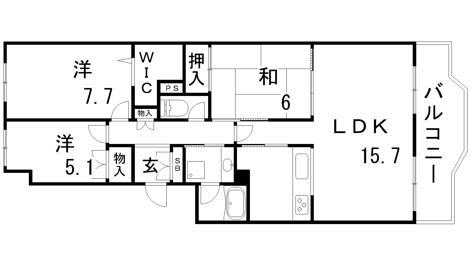 - LDK15.7帖、和室6帖、洋室7.7帖、洋室5.1帖
