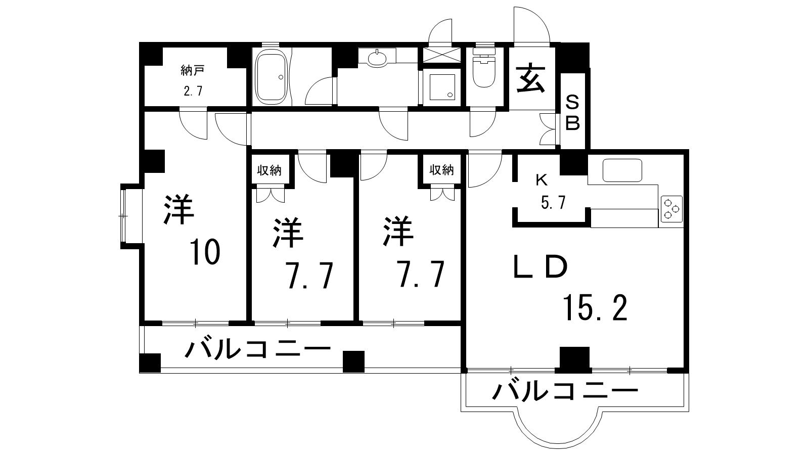 - LD15.2帖、洋室7.7帖、洋室7.7帖、洋室10帖