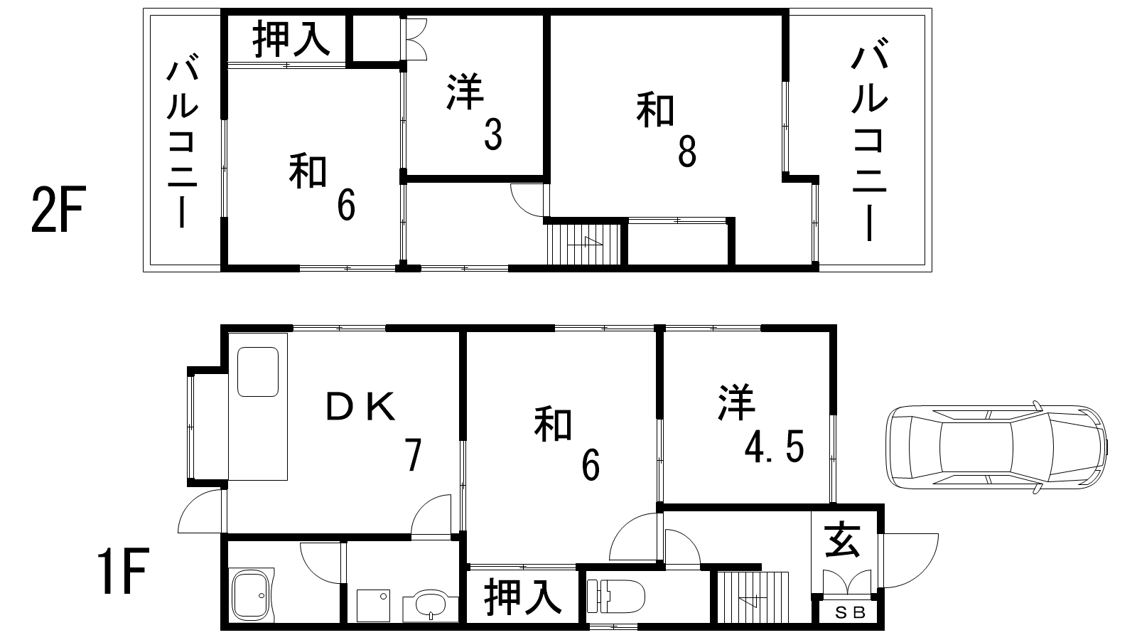 - DK7帖、和室6帖、和室6帖、和室8帖、洋室4.5帖、洋室3帖