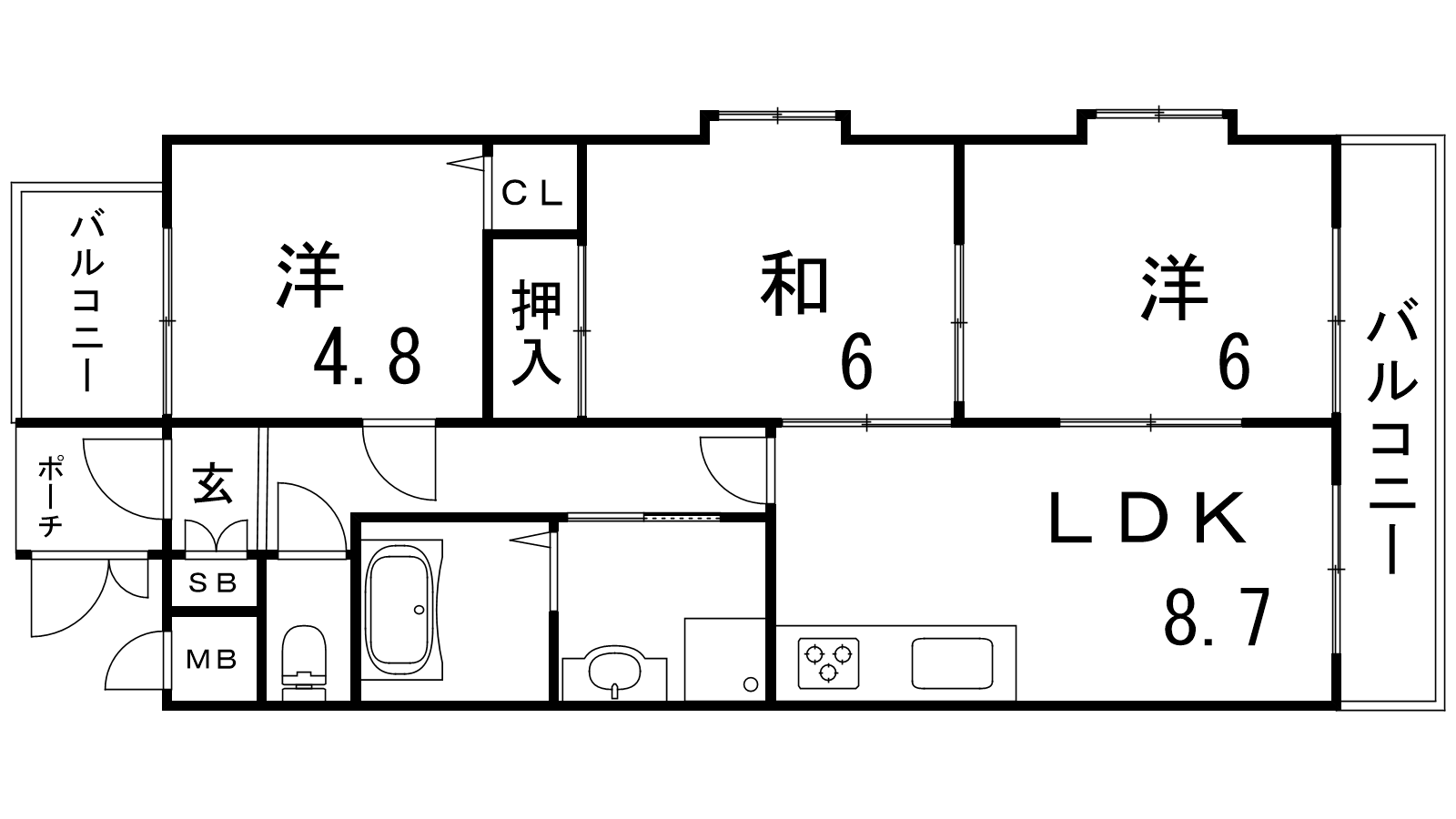 - LDK8.7帖、洋室6帖、和室6帖、洋室4.8帖