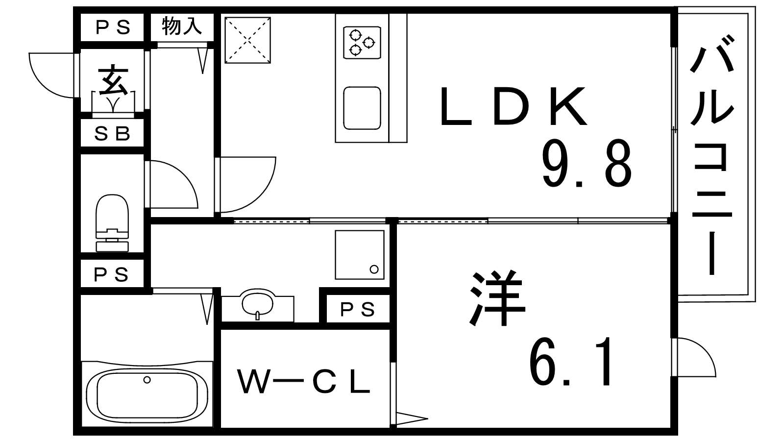 - 洋室6.1帖、LDK9.8帖