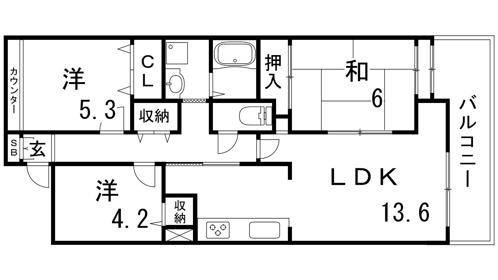 - LDK13.6帖、洋室5.3帖、洋室4.2帖、和室6帖