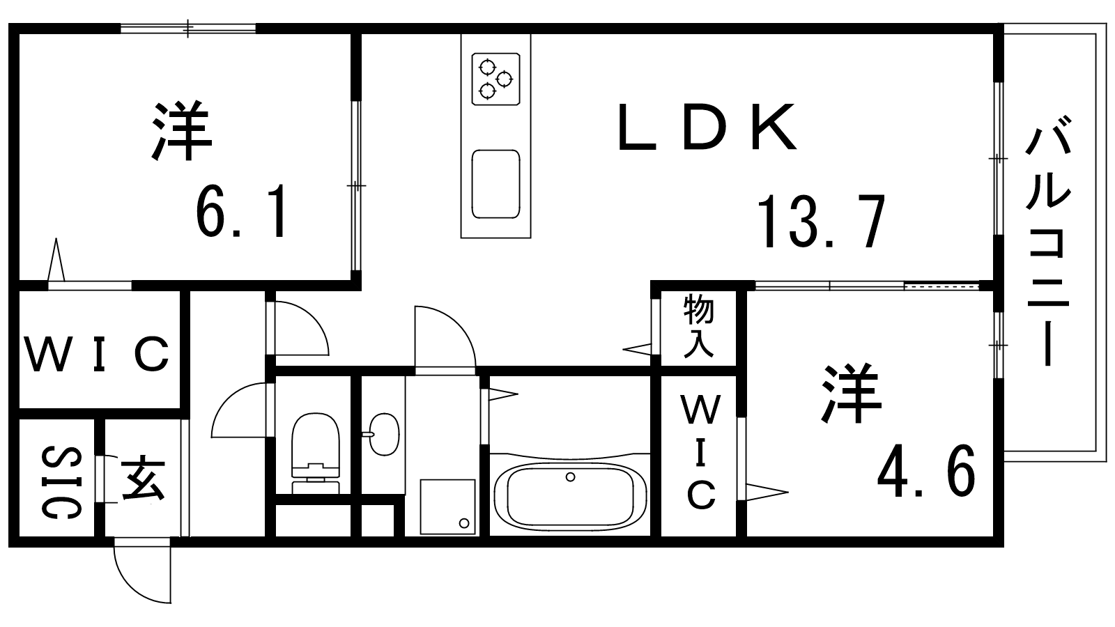 - LDK13.7帖、洋室6.1帖、洋室4.6帖