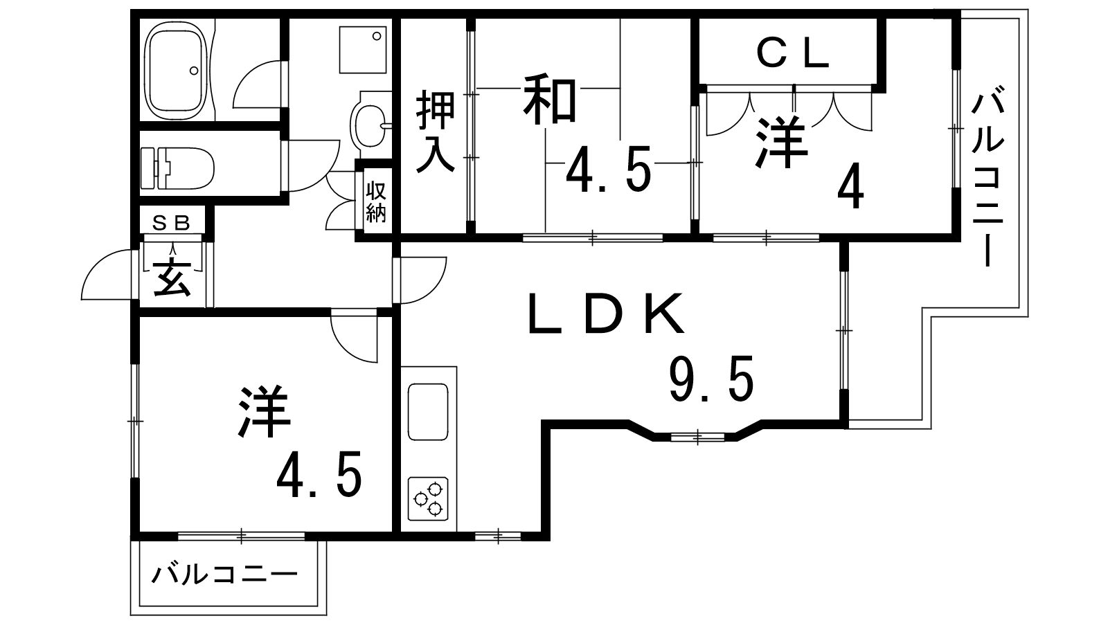- LDK9.5帖、洋室4帖、洋室4.5帖、和室4.5帖