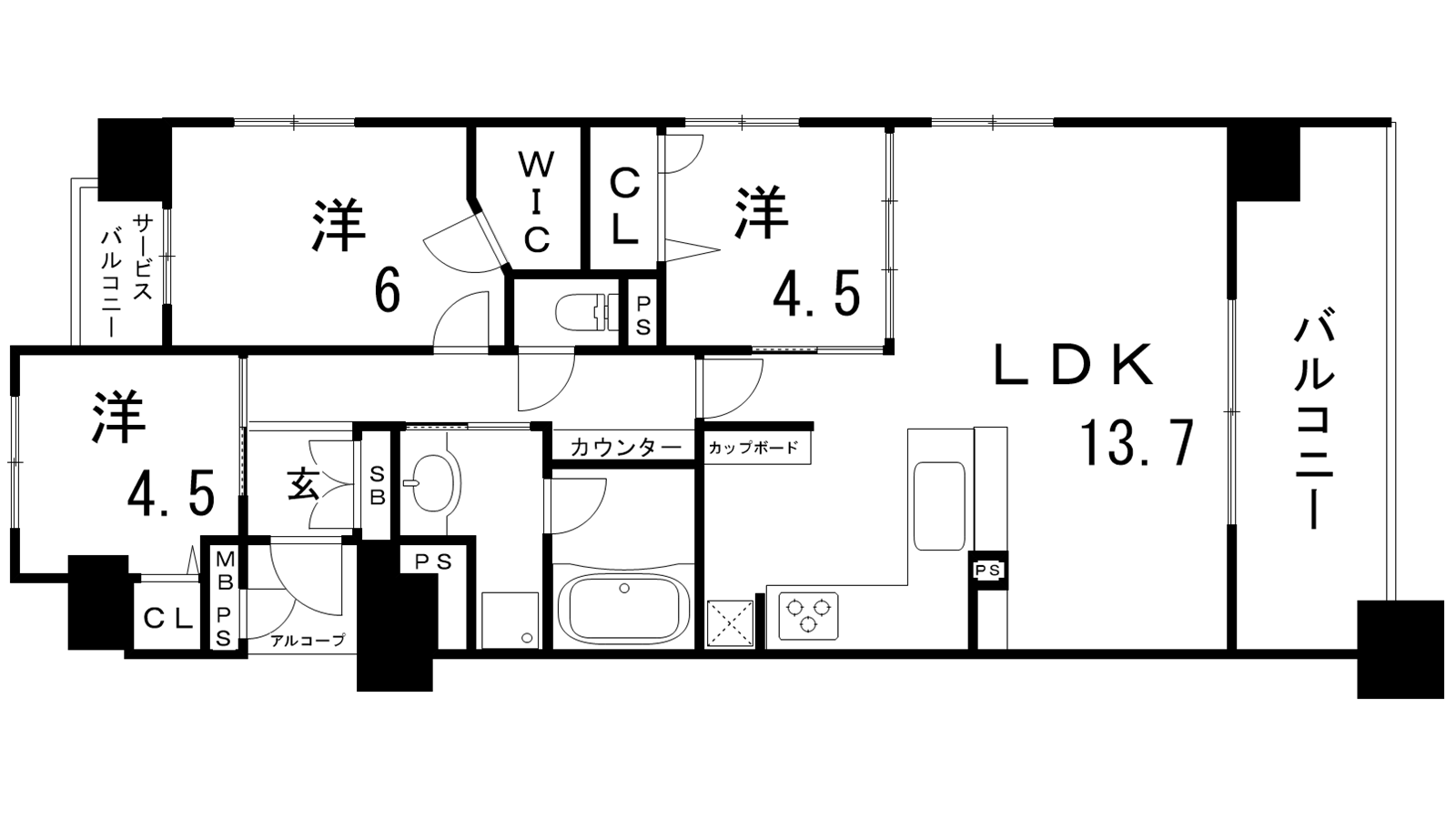 - LDK13.7帖、洋室6帖、洋室4.5帖、洋室4.5帖