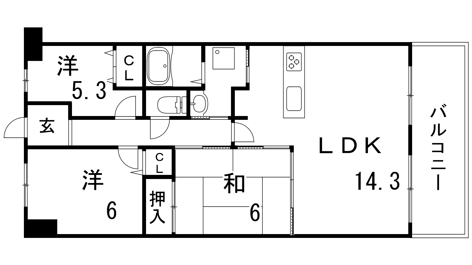 - LDK14.3帖、和室6帖、洋室6帖、洋室5.3帖
