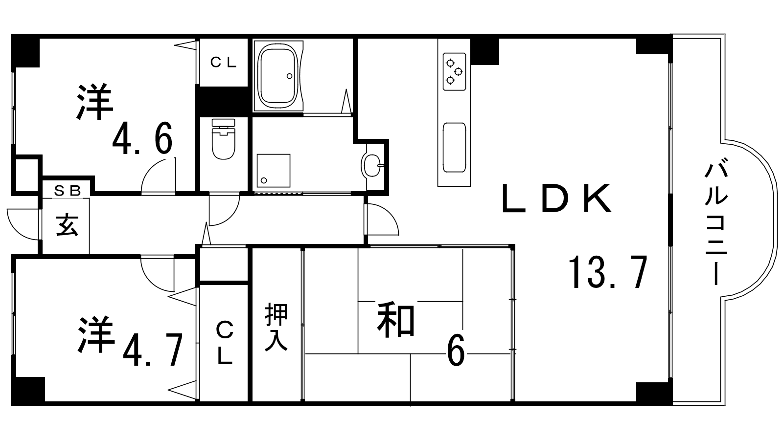 - LDK16帖、洋室4.7帖、洋室4.6帖、和室6帖