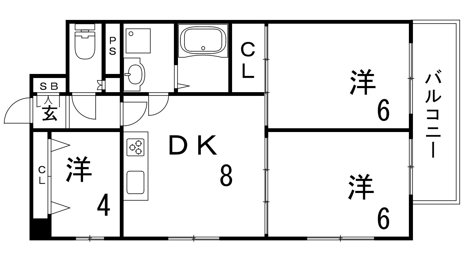 - DK8帖、洋室6帖、洋室4帖、洋室6帖