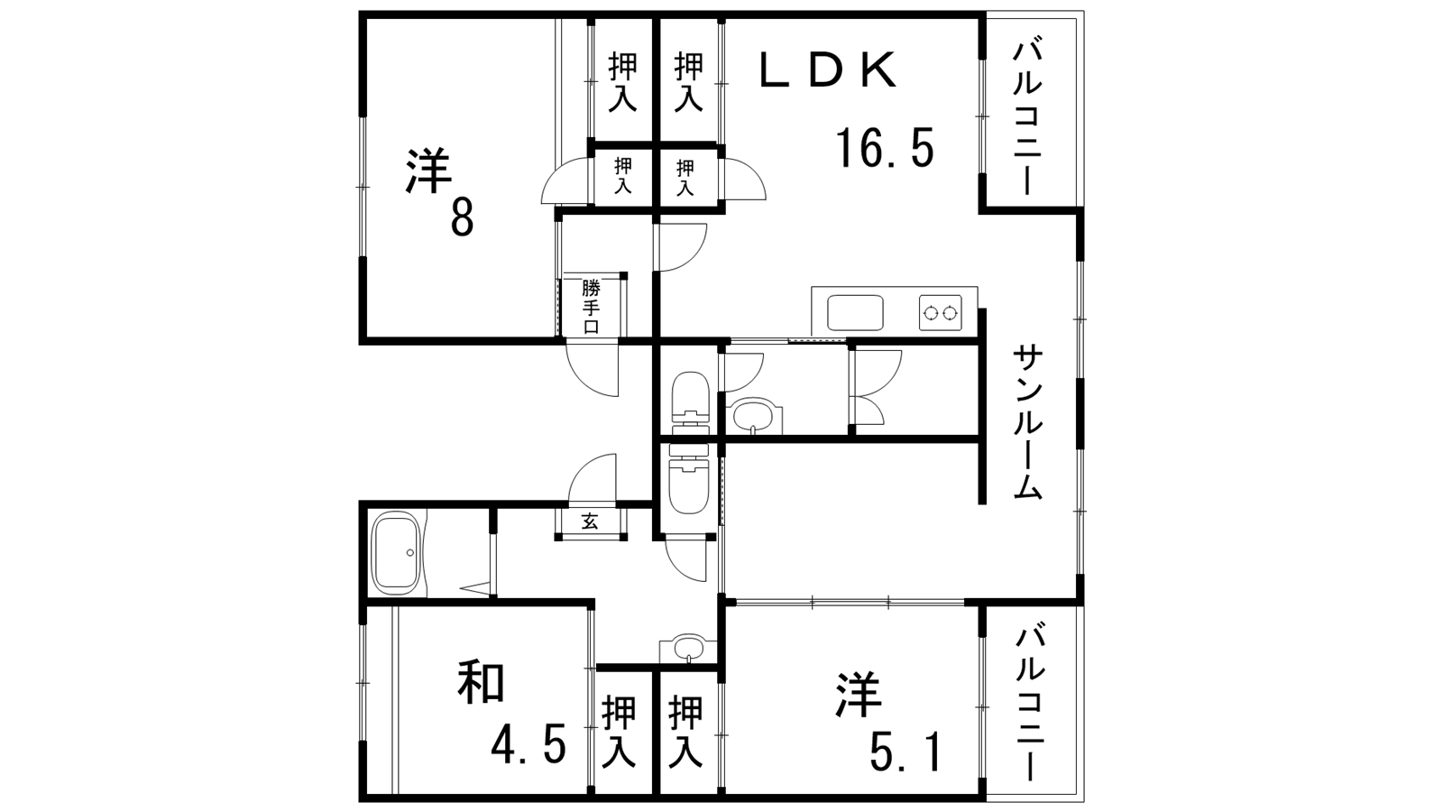 - LDK16.5帖、洋室5.1帖、洋室8帖、和室4.5帖