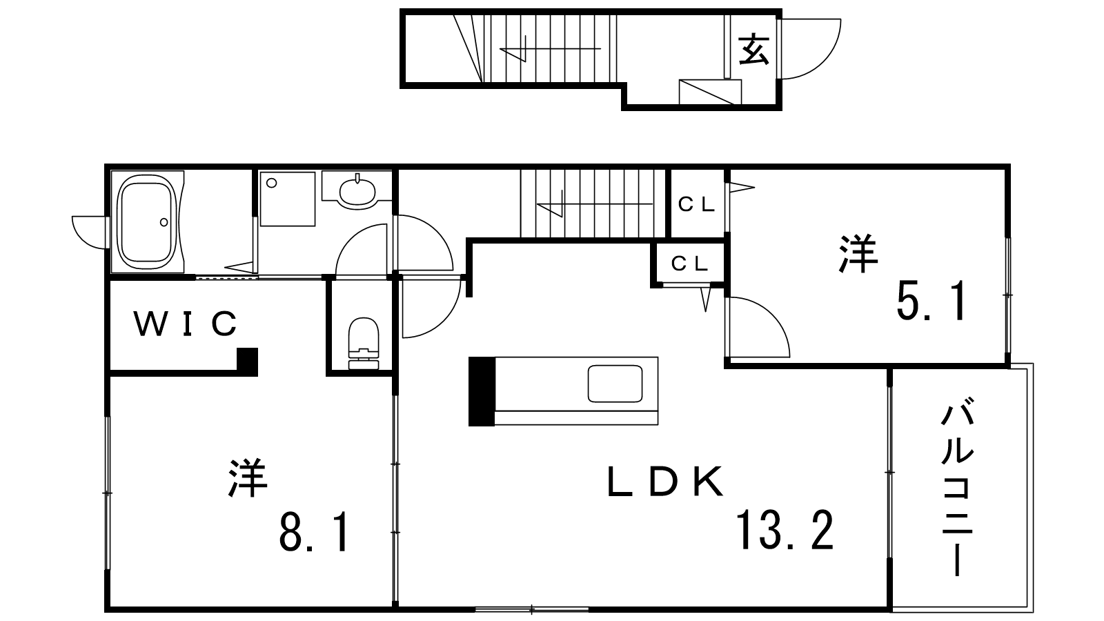 - LDK13.2帖、洋室8.1帖、洋室5.1帖