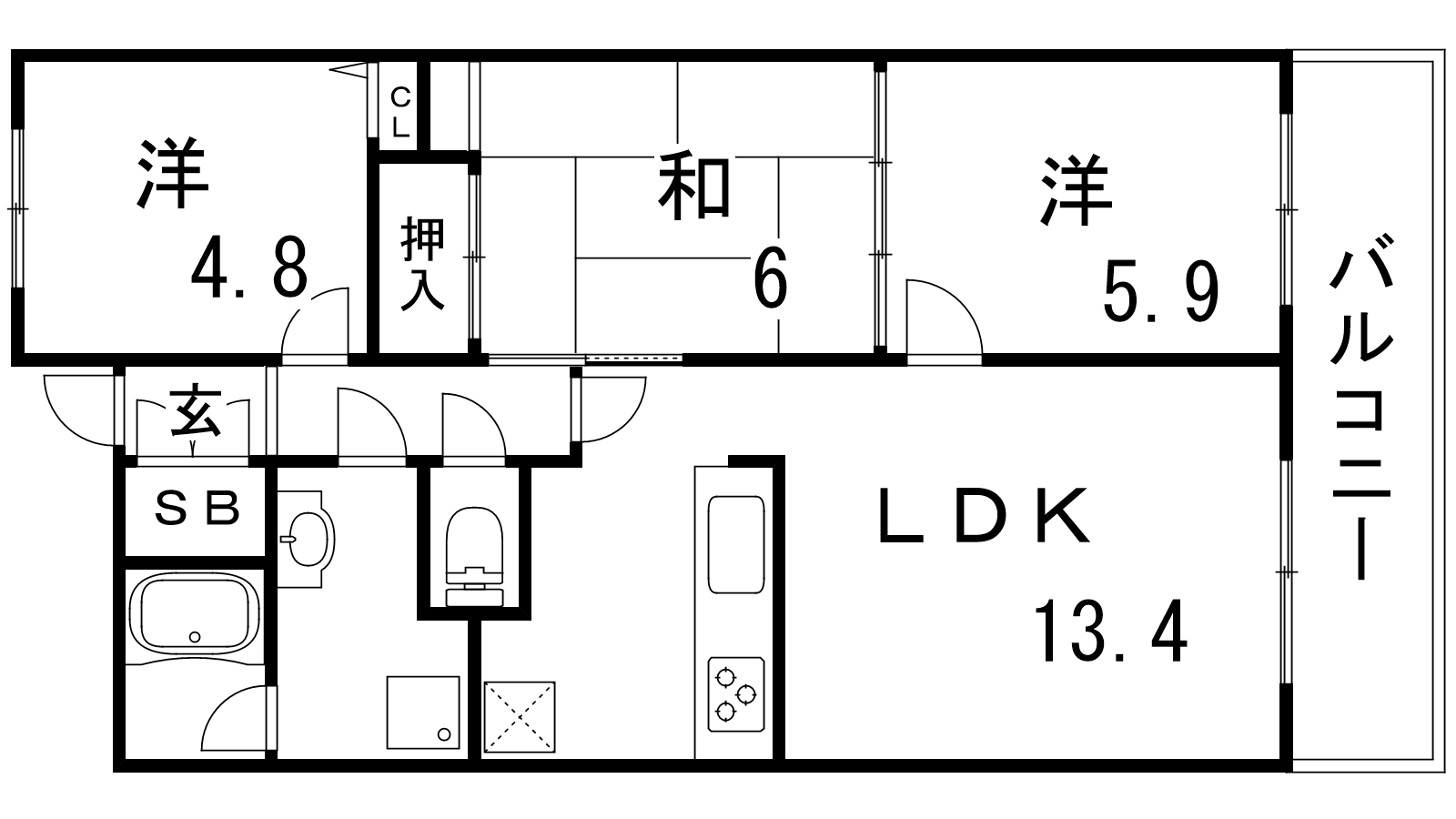 - LDK13.4帖、和室6帖、洋室5.9帖、洋室4.8帖