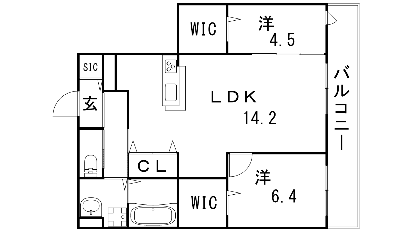 - LDK14.2帖、洋室6.4帖、洋室4.5帖