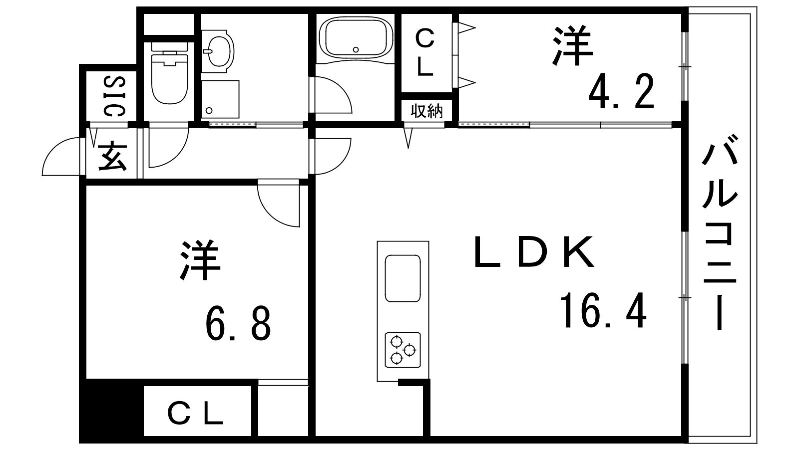 - 洋室6.8帖、洋室4.2帖、LDK16.4帖