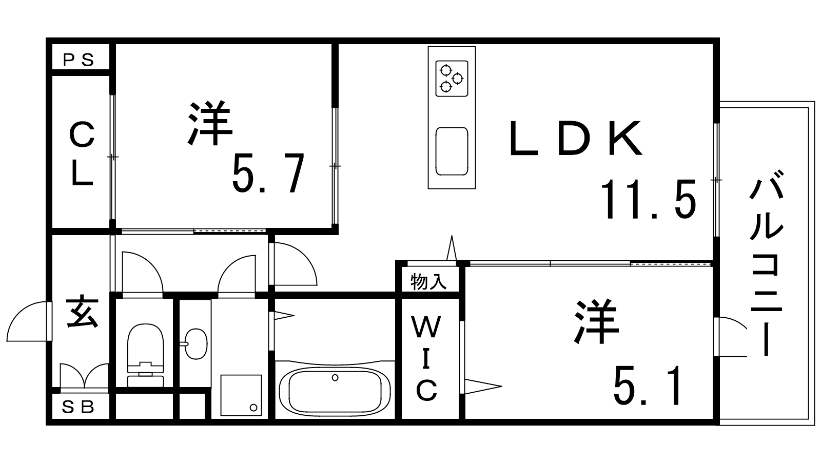 - LDK11.5帖、洋室5.7帖、洋室5.1帖