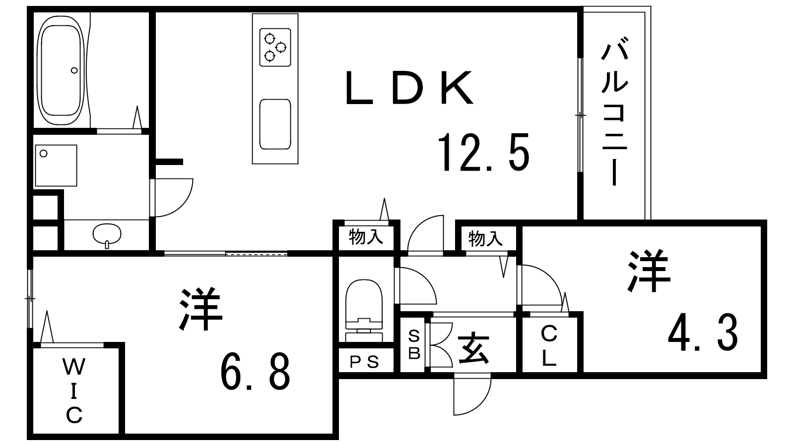 - LDK12.5帖、洋室4.8帖、洋室6.8帖