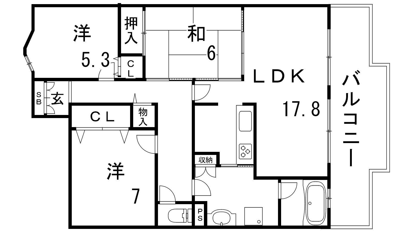 - LDK17.8帖、洋室7帖、洋室5.3帖、洋室6帖
