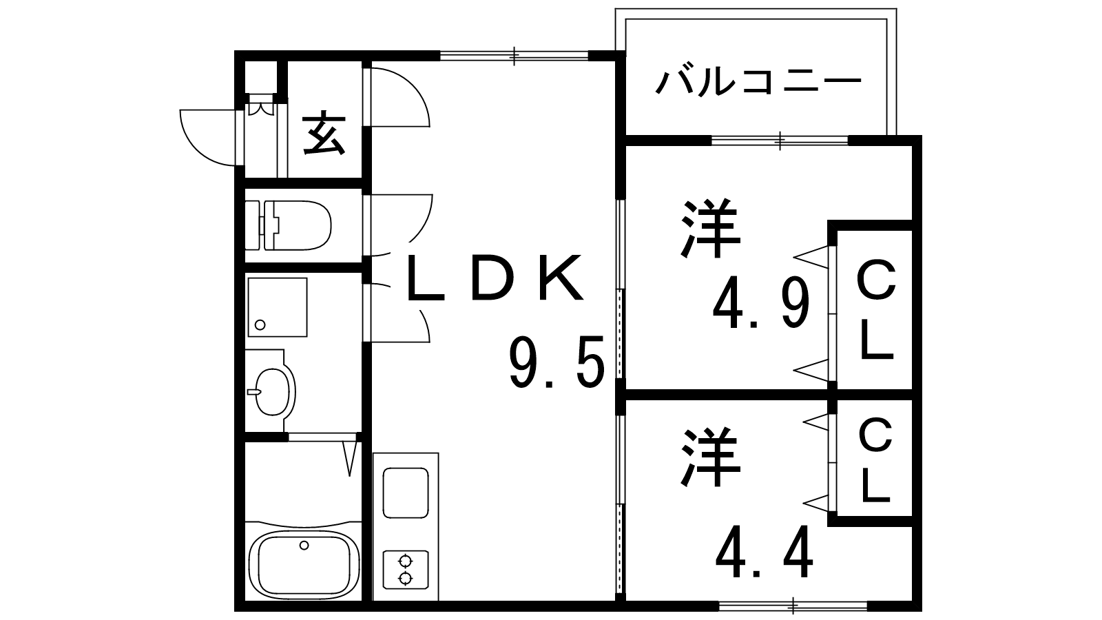 - LDK9.5帖、洋室4.4帖、洋室4.9帖