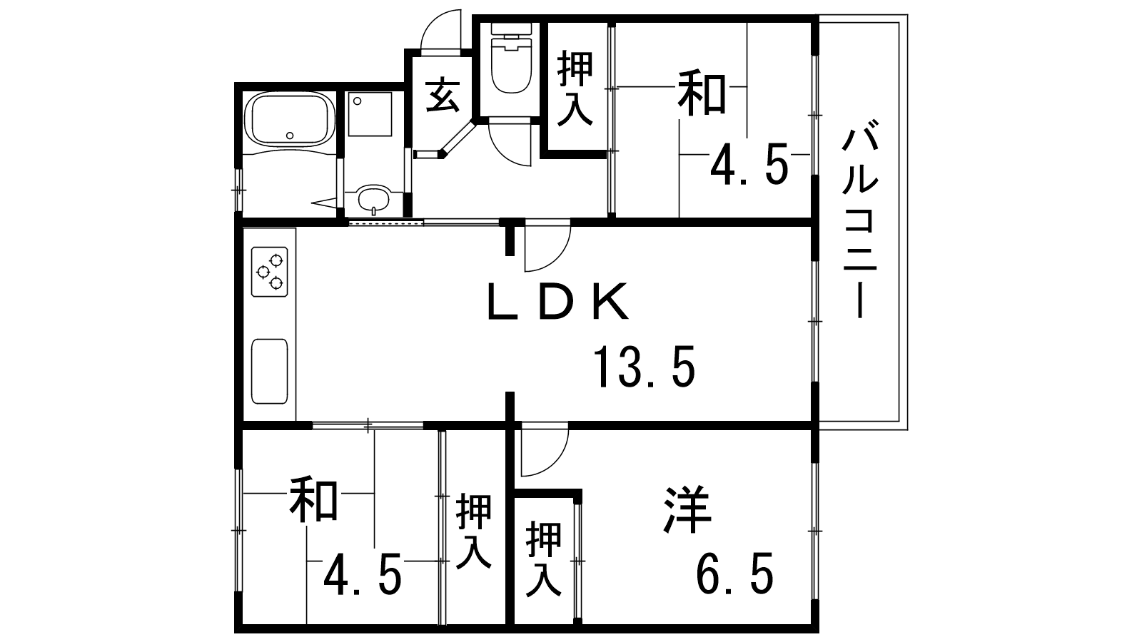 - LDK13.5帖、洋室6.5帖、和室4.5帖、和室4.5帖