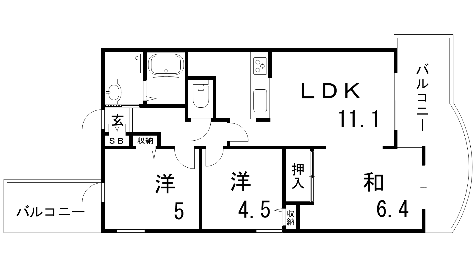 - LDK11.1帖、洋室5帖、洋室4.5帖、和室6.4帖
