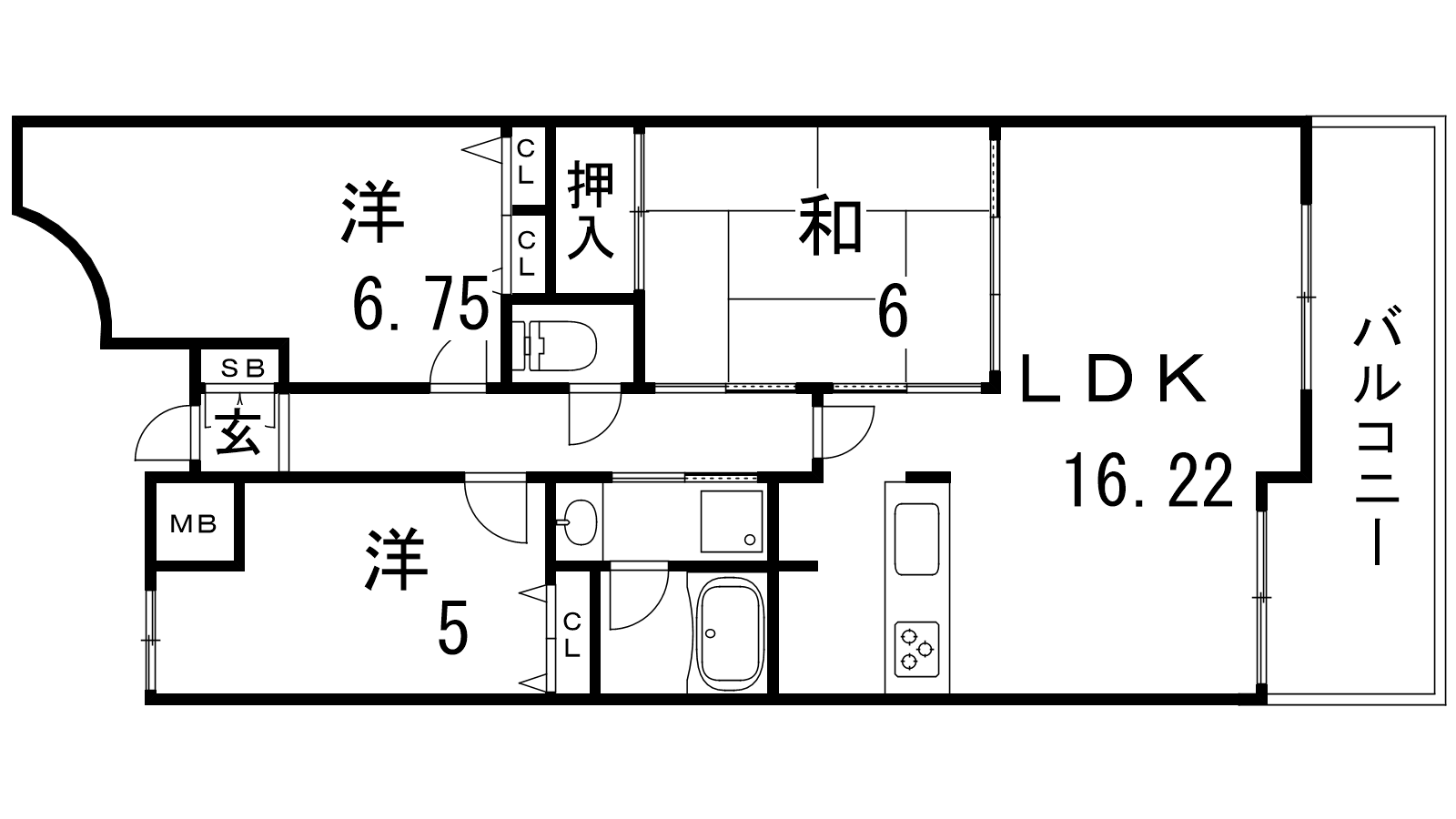 - 和室6帖、洋室6.75帖、洋室5帖、LDK16.22帖