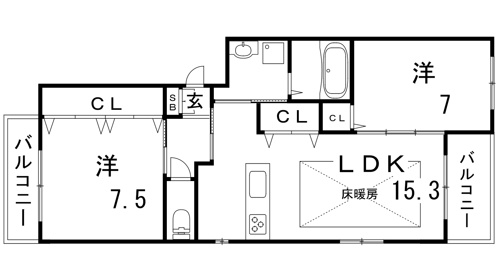 - LDK15.3帖、洋室7帖、洋室7.5帖