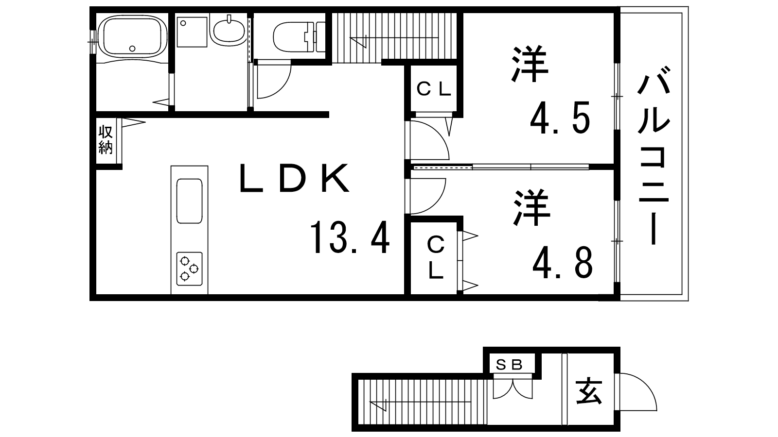 - LDK13.4帖、洋室4.8帖、洋室4.5帖
