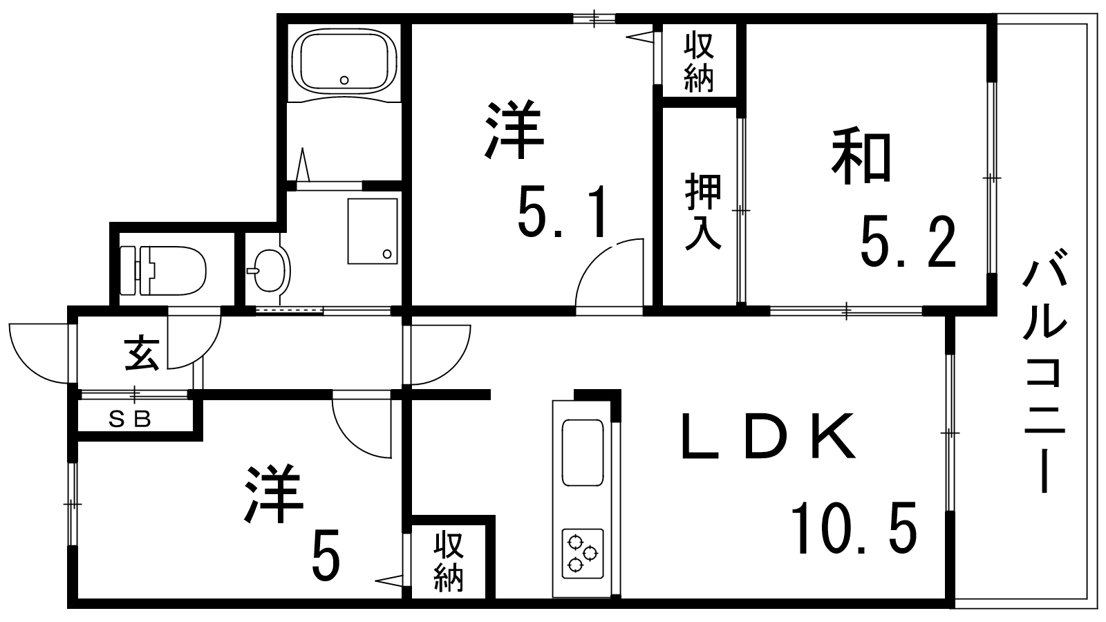 - LDK10.5帖、和室5.2帖、洋室5.1帖、洋室5帖