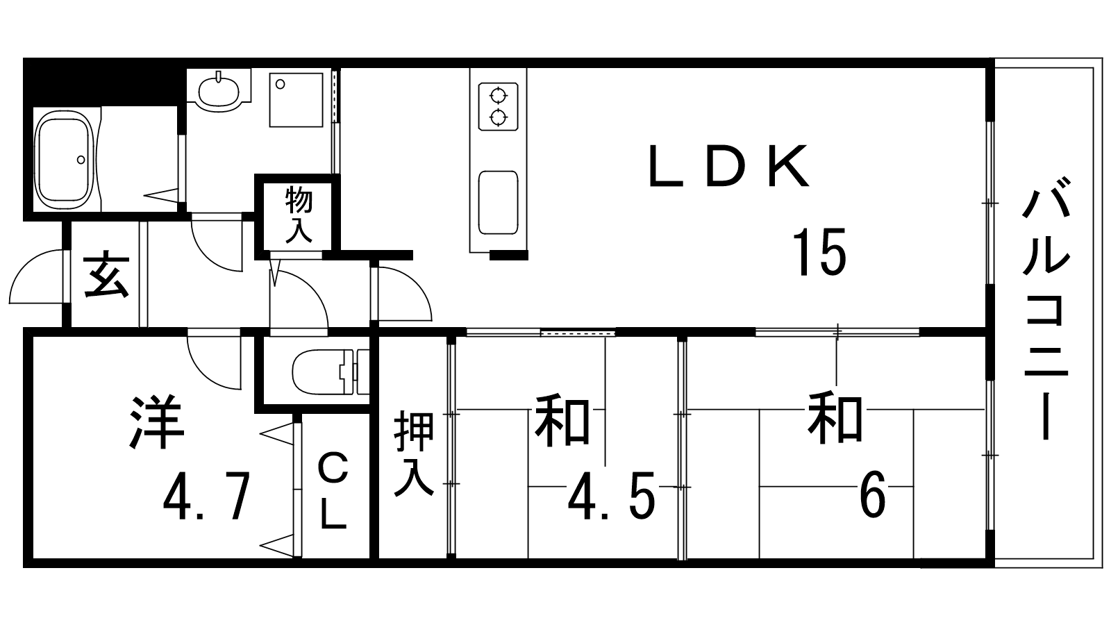 - LDK15帖、洋室4.7帖、和室6帖、和室4.5帖