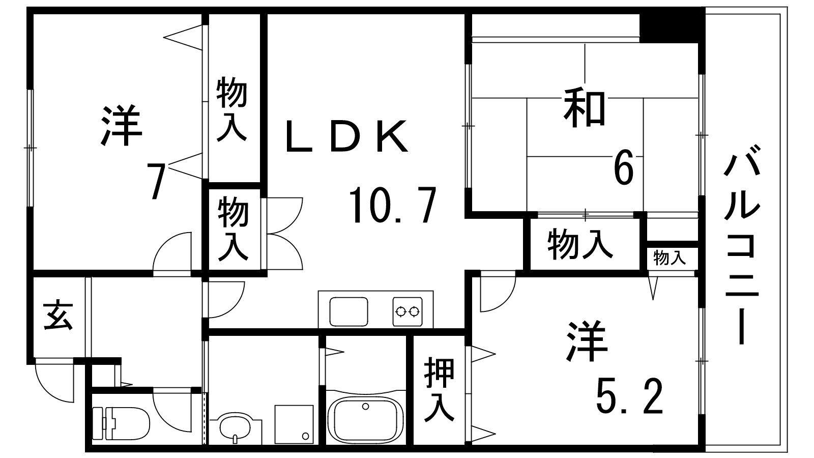 - LDK10.7帖、洋室5.2帖、洋室7帖、和室6帖