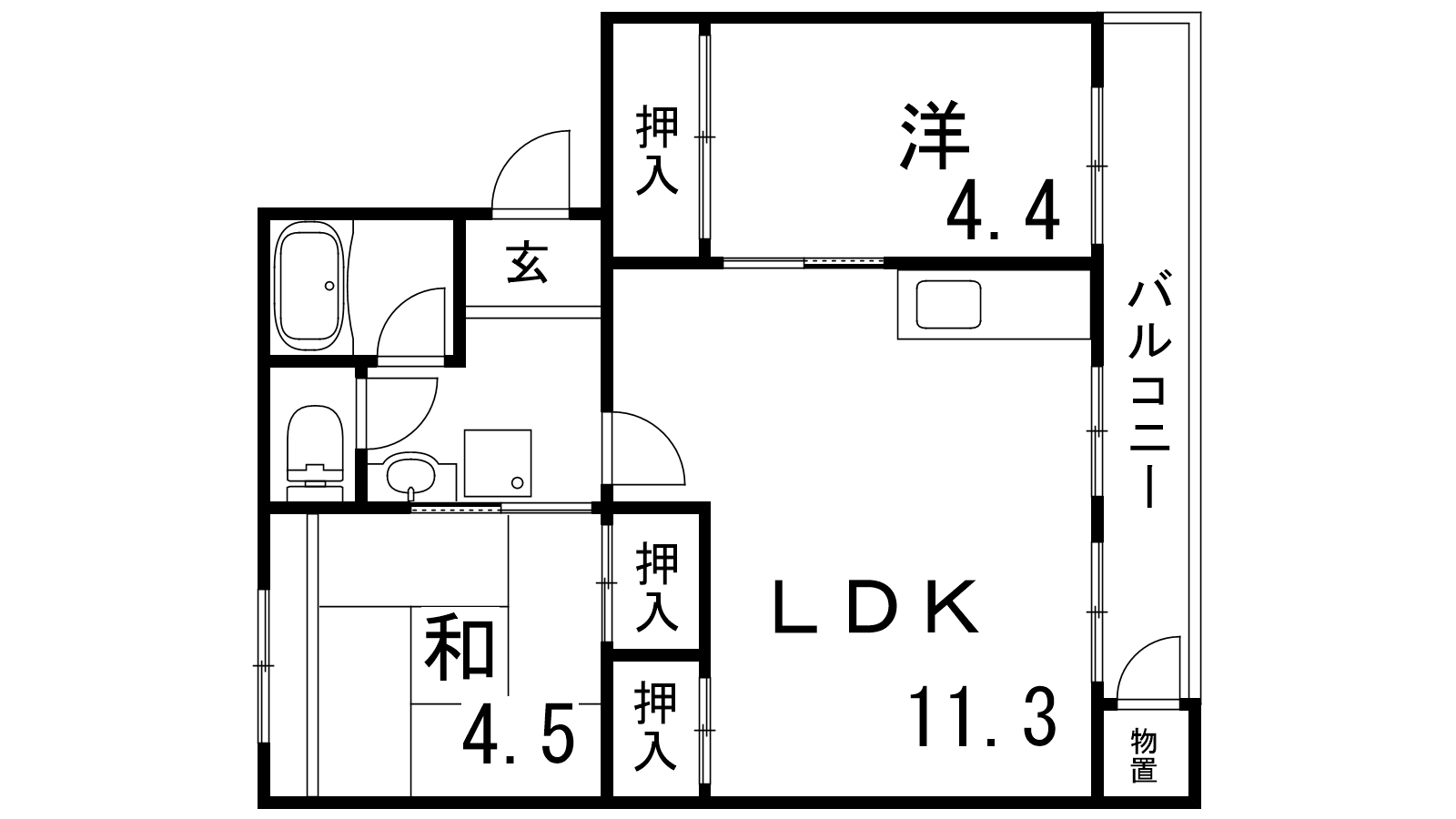 - LDK12.3帖、洋室4.4帖、和室4.5帖