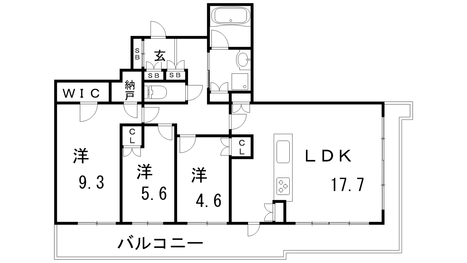 - LDK17.7帖、洋室4.6帖、洋室5.6帖、洋室9.3帖