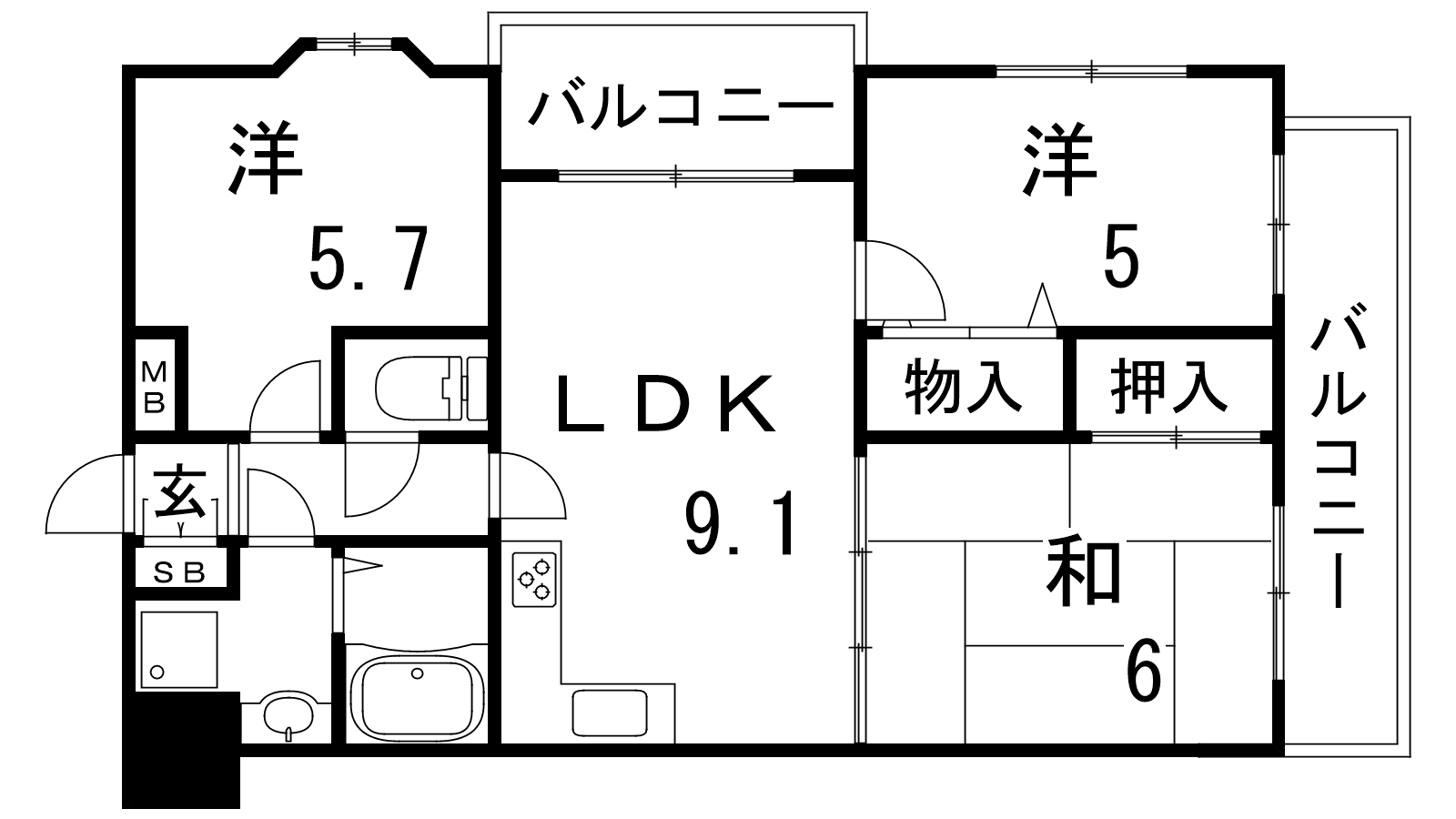 - LDK9.1帖、和室6帖、洋室5帖、洋室5.7帖