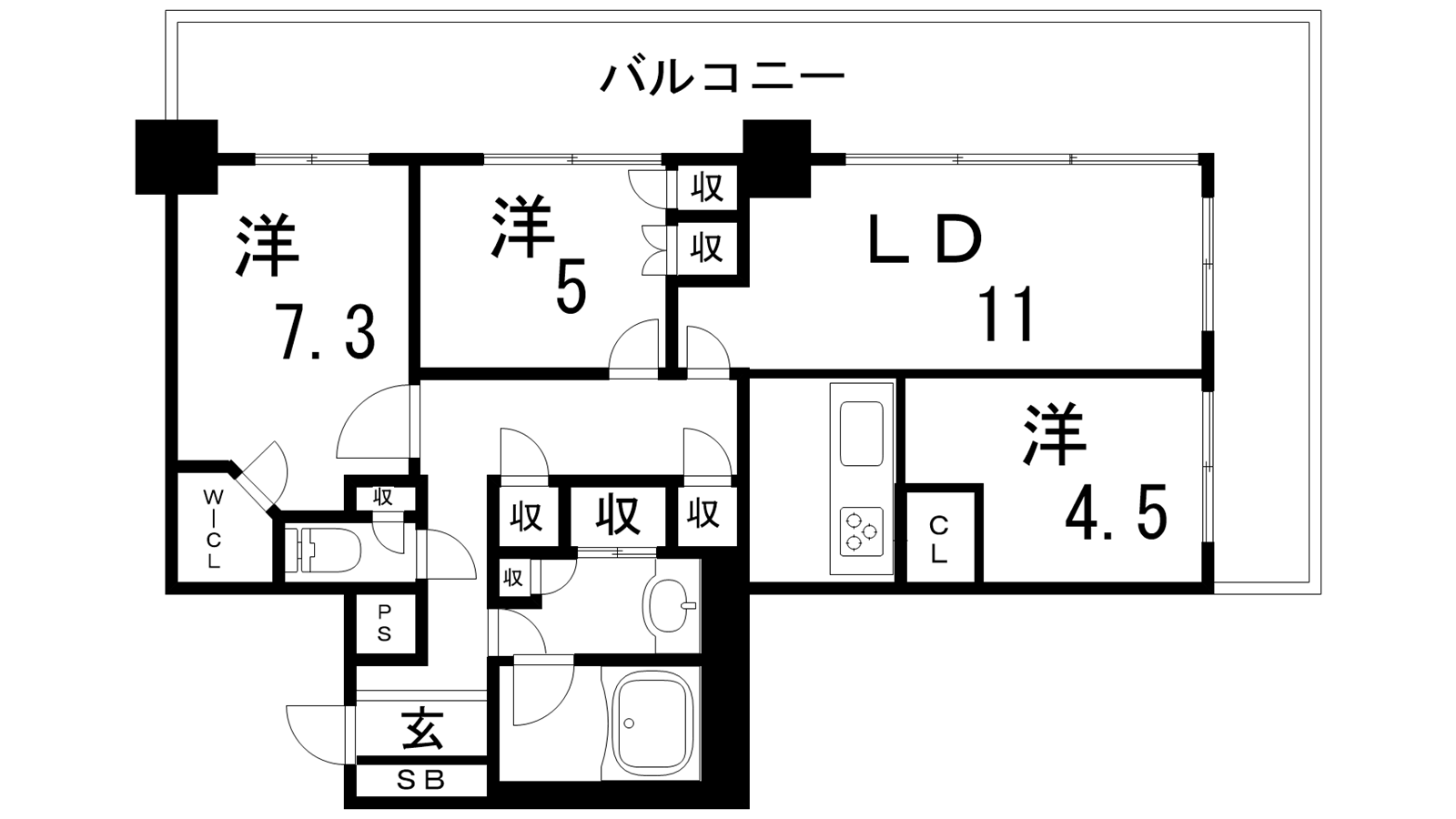 - LDK11帖、洋室7.3帖、洋室5帖、洋室4.5帖