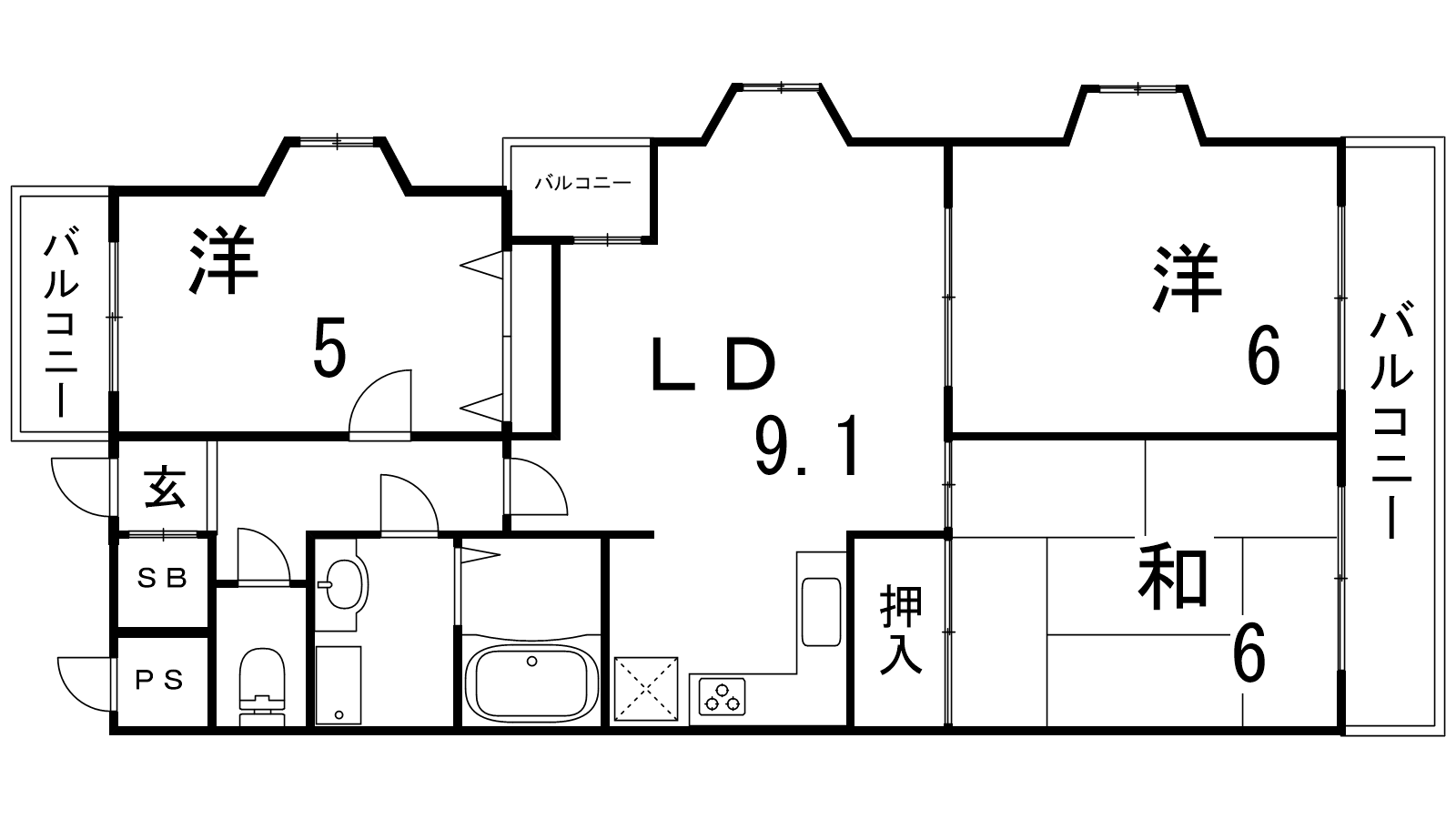 - LDK9.1帖、洋室6帖、和室6帖、洋室5帖