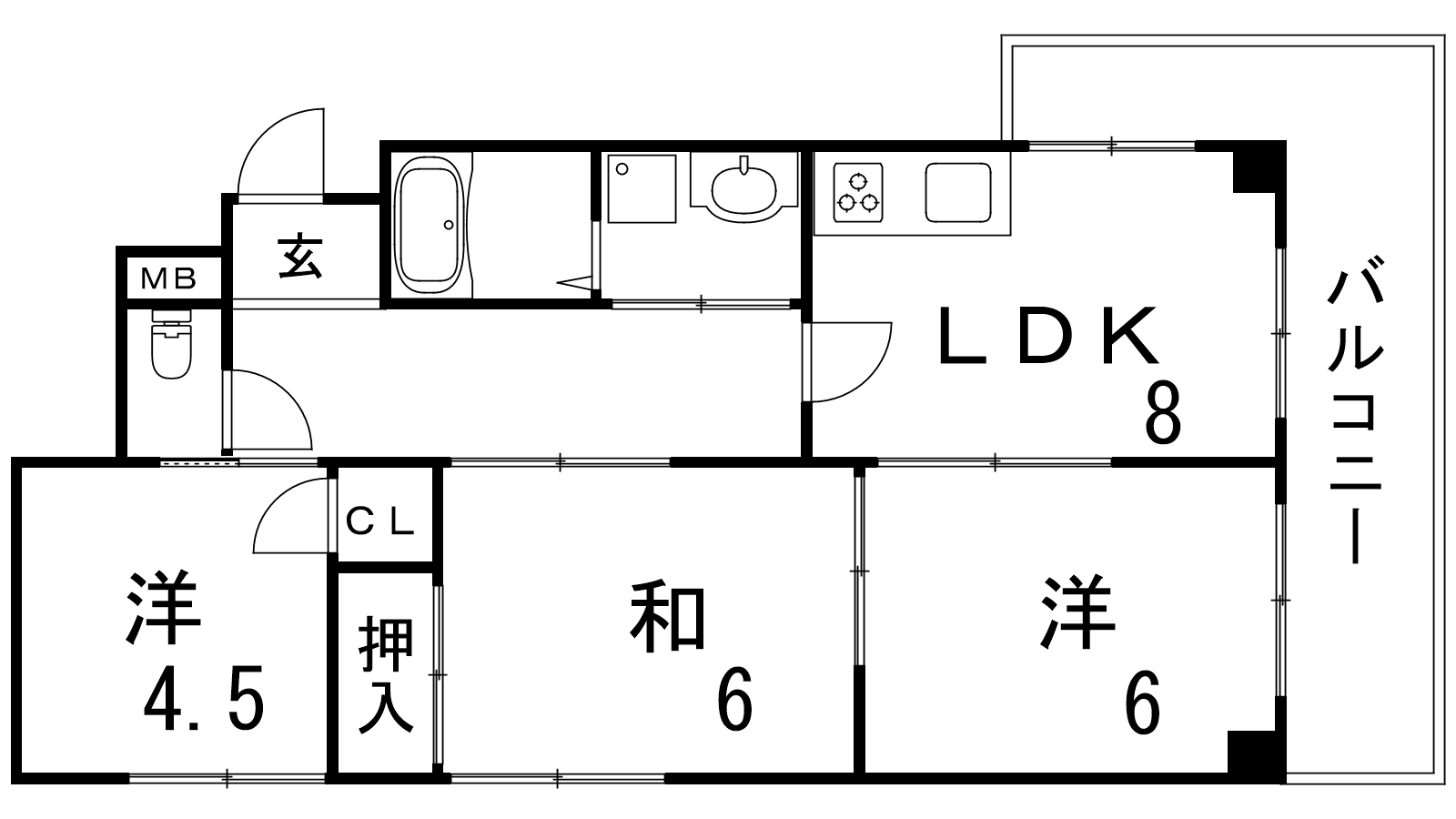 - LDK8帖、洋室6帖、洋室4.5帖、和室6帖