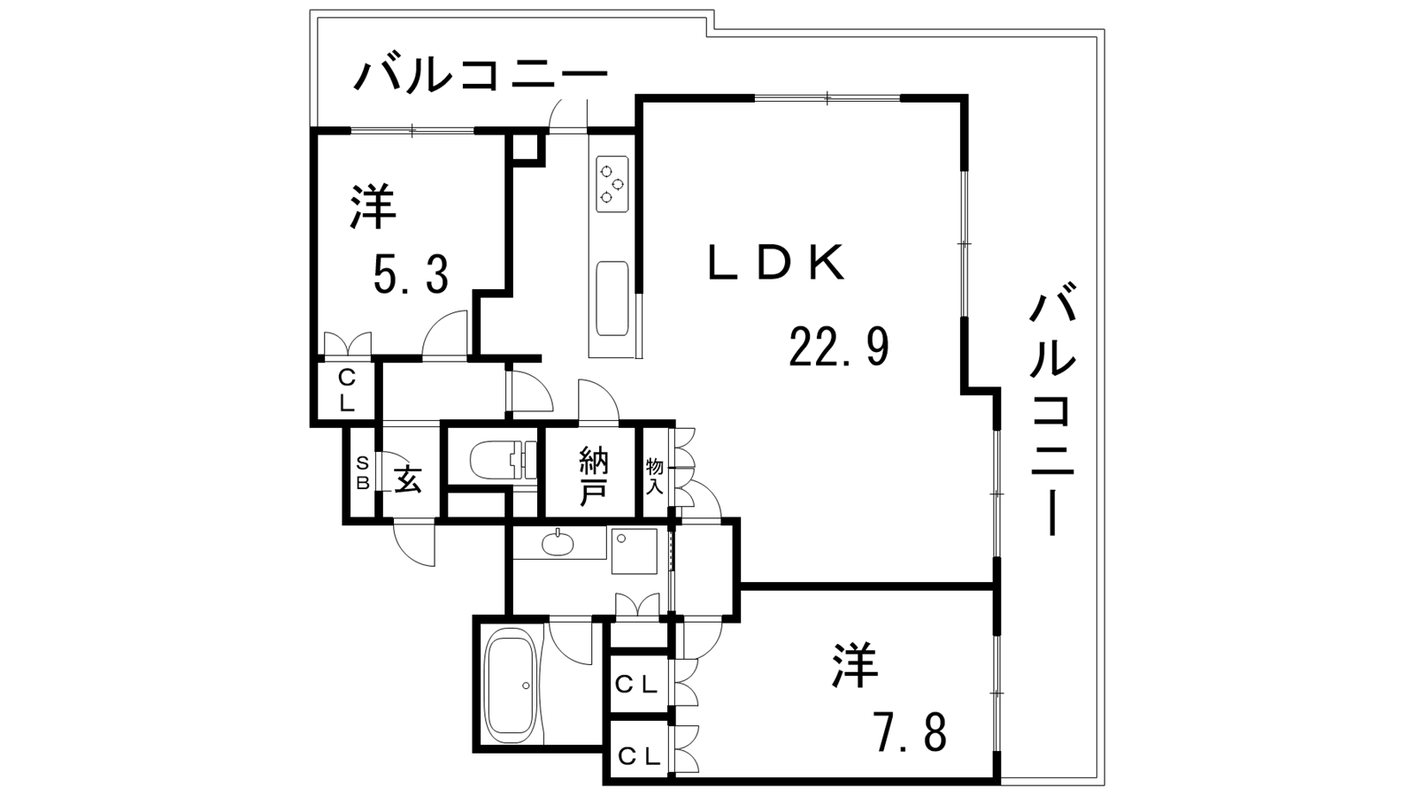 - LDK22.9帖、洋室7.8帖、洋室5.3帖