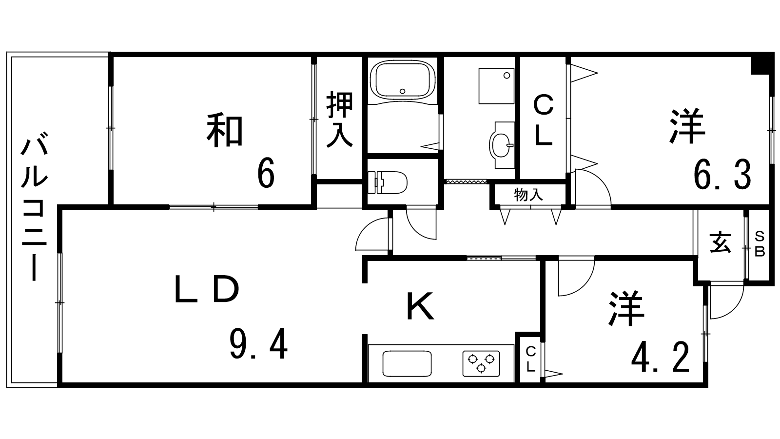 - LDK9.4帖、洋室6.3帖、洋室4.2帖、和室6帖