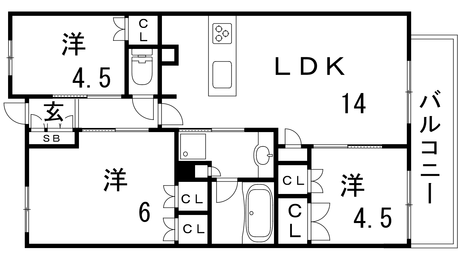 - LDK14帖、洋室6帖、洋室4.5帖、洋室4.5帖