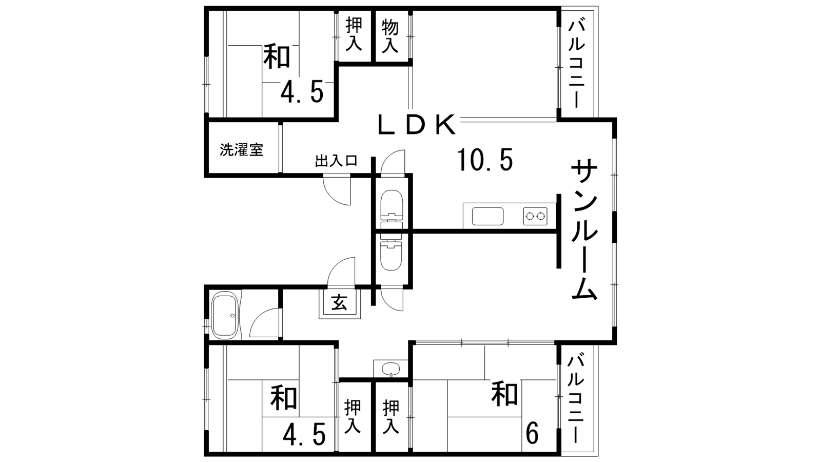 - LDK10.5帖、和室4.5帖、和室4.5帖、和室6帖