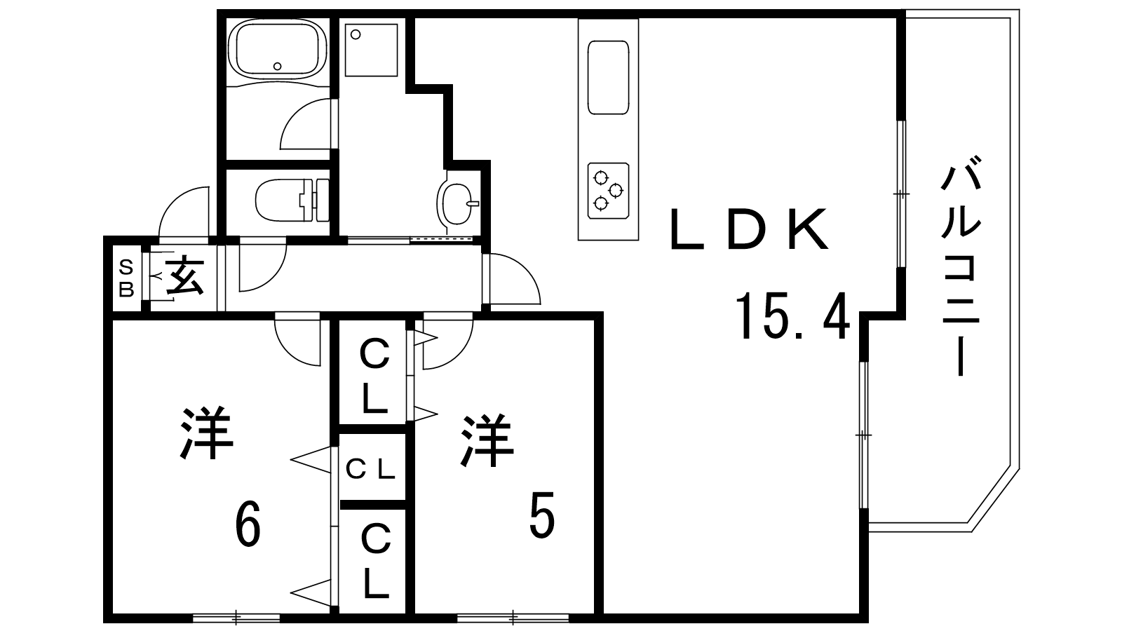 - LDK15.4帖、洋室6帖、洋室5帖