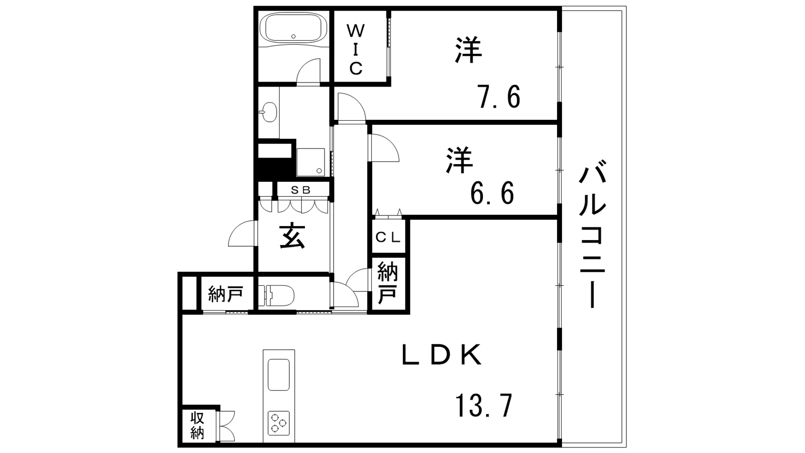 - LDK13.7帖、洋室6.6帖、洋室7.5帖