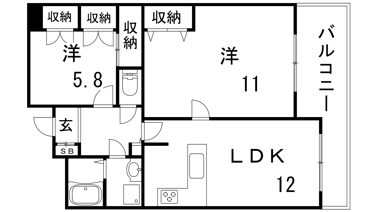- LDK12帖、洋室11帖、洋室5.8帖