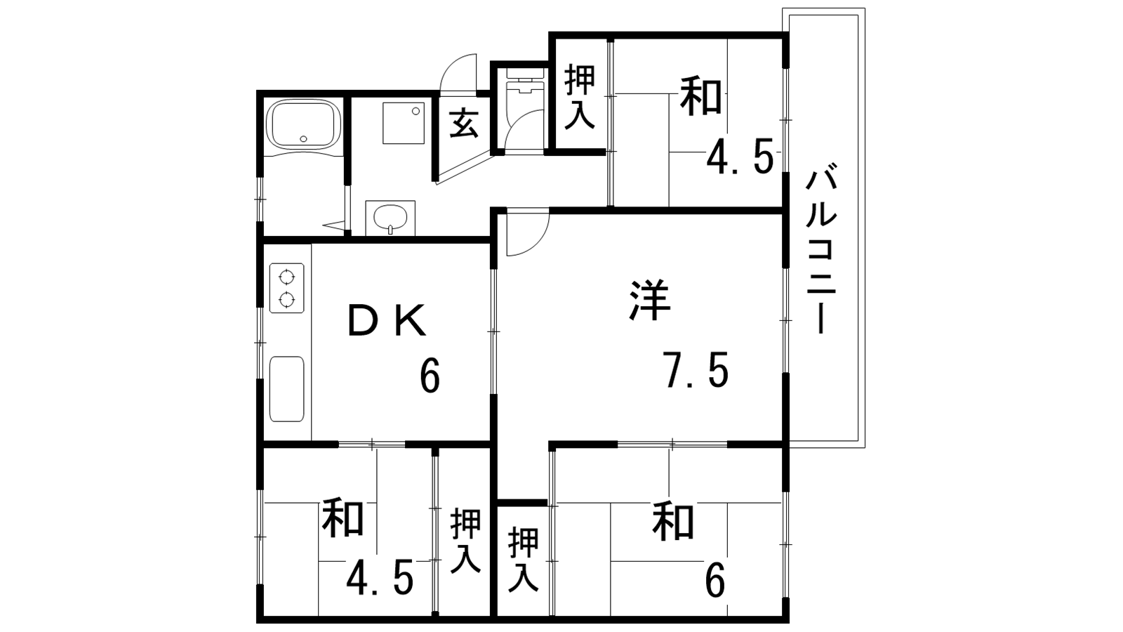 - DK6帖、和室4.5帖、和室4.5帖、和室6帖、DK7.5帖