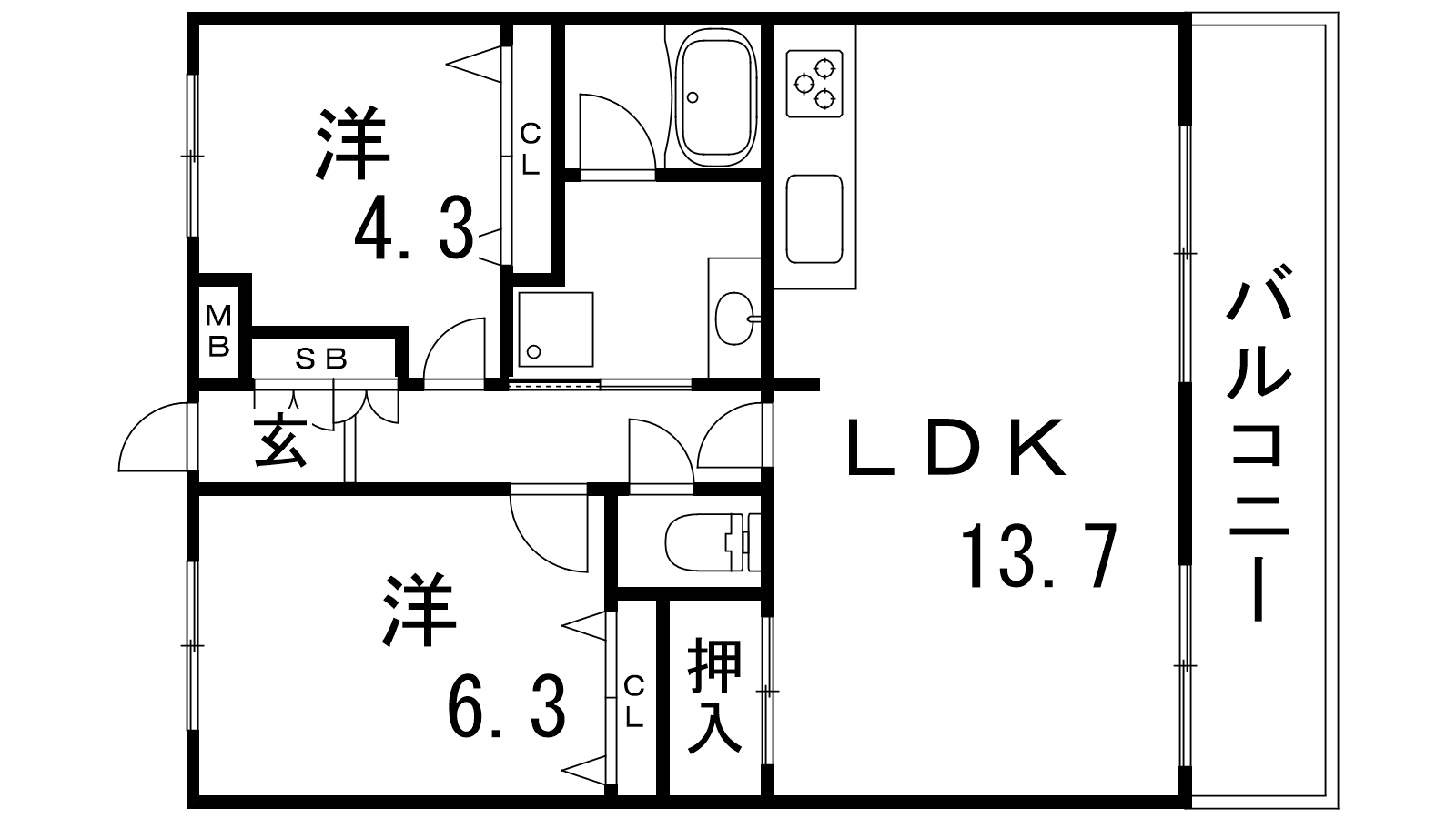 - LDK13.7帖、洋室4.3帖、洋室6.3帖