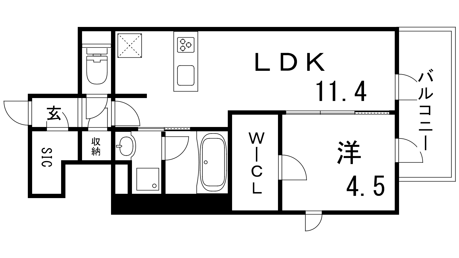 - 洋室4.5帖、LDK11.4帖