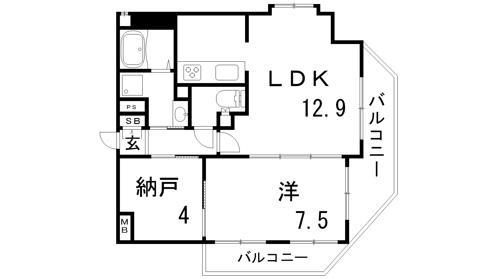 - LDK12.9帖、和室7.5帖、S4帖